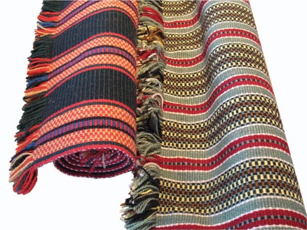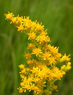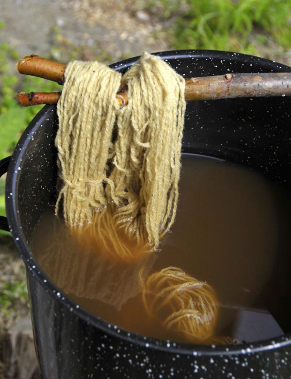 As you meander downstream toward drier, sunnier streambanks, especially those that meet abandoned fields or roadsides, scout for Canada goldenrod (Solidago Canadensis). This native plant flowers in late summer and early fall. Under the hand and eye of a skillful dyer, the brilliant yellow color of goldenrod flowers translates into beautifully hued dye for wool. Increasing the concentration of the dye with more plant material means deeper, more intense colors, while selecting only certain parts of the plant, such as the flower heads, will shift the colors. Susanne Grosjean, a weaver and rugmaker from Franklin, Maine, harvests all of the above-ground parts of goldenrod for her dyepot, though she notes that “the flowers will give you very clear yellows, the leaves will give greener, tanner yellows.”