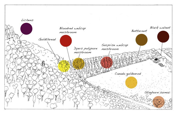 Join us on a virtual field walk to learn about some of these dye species, the particular places where they grow, and some artisans in our region who use them to put a creative twist on “local color.” Bring a basket, a few grocery bags, comfortable shoes, and garden clippers. The map shown below will be our guide to this imaginary landscape.