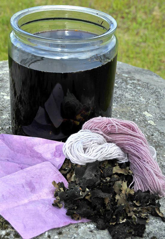 The ancient Phoenicians used lichens to dye cloth purple – the color of royalty – as early as 3000 BC. Anne Williams, of Deer Isle, Maine, keeps a perennial lichen dyebath going in her garage, adds new material once in awhile, and soaks wool for up to four months to get the most intense purples.