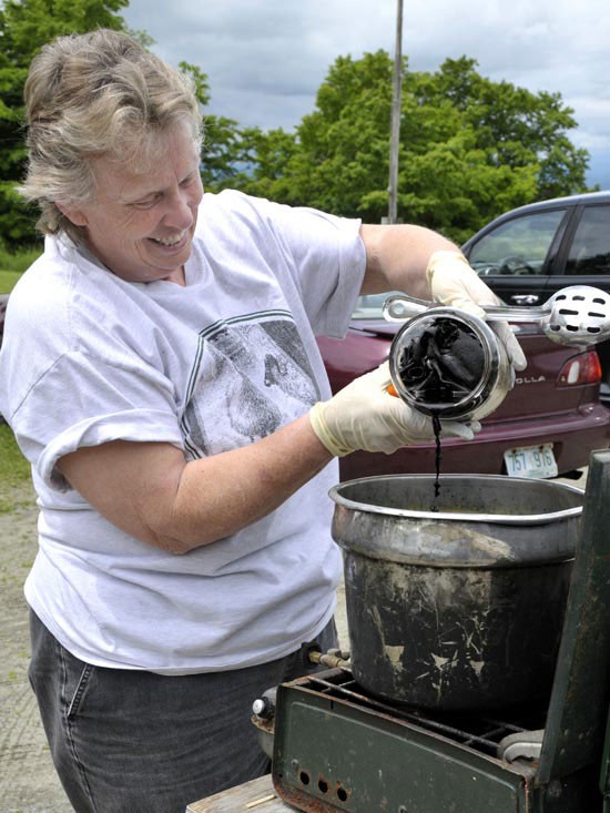 Kate Smith, a fiber artist from Marshfield, Vermont, cuts small (less than half an inch thick) sumac branches before the berries come out in late summer, scrapes the bark off, and boils it to produce yellows and tans for dyeing wool. Judy Dow uses the entire twig to dye her basket materials yellow. Almost all parts of a sumac plant can be used for dyes – Native Americans across the country extracted pigments from the leaves, twigs, berries, and pith of woody trunks, as well as from the bark and roots. The Navajo and Hopi use another sumac species to make an intense black from boiled leaves and twigs that are processed with clay and piñon pine gum.