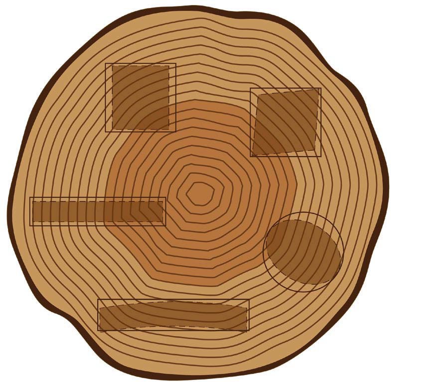 We can think of tree trunks having three directions: length (up and down the tree; parallel to the grain), tangential (parallel to the growth rings), and radial (from the center of the trunk to the outside; perpendicular to the growth rings). As the moisture content of normal wood dips below the fiber saturation point, it shrinks differently in these three directions.