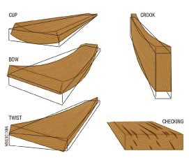Even normal wood changes shape as it dries. Round crosssections don’t stay round, squares distort, and boards that aren’t quarter-sawn cup. The drawing on page 46 shows the shrinkage and distortion that can be expected in normal wood.