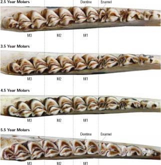 Separating older deer into specific age classes requires comparing the width of dentine to the width of enamel on either side of it on the three molars. On a two year-old deer, the width of dentine on the first molar will be less than twice as wide as a width of enamel around it. On a three year-old, the width of dentine will be at least twice as wide as a width of enamel around it on the first molar, and less than twice as wide as a width of enamel around it on the second and third molars. On a four-year-old, the width of dentine will be at least twice as wide as the width of enamel around it on the first and second molars and less than twice as wide as a width of enamel around it on the third molar. Once a deer gets above five years old, the width of dentine will be at least twice as wide as the width of enamel on all three molars.