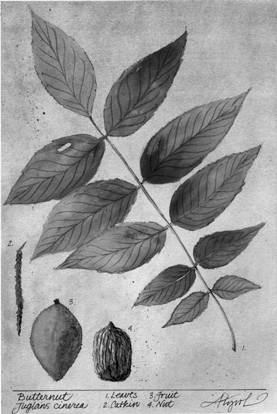 As he turns off the paved road onto a dirt road, and then onto an even smaller dirt road to the log-landing, he often finds himself surrounded by big maple trees, ashes and basswoods. Then, he’ll spot it—the first butternut tree – on a hillside, a favorite spot for butternut. The trees also like light, so they grow in clearings caused by fire, logging or heavy winds. And they like limey soil. Nichols notes that ginseng and wild ginger, two other lime-loving plants, often are found near butternuts.