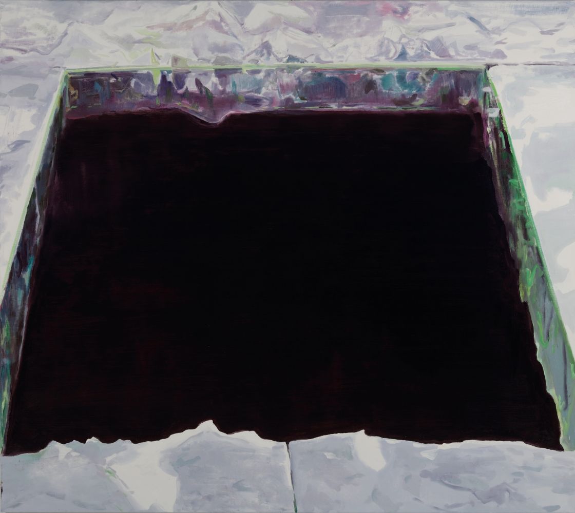 Ice Cut (Violet Kennebec) is part of a yearslong series of paintings depicting Eric Aho’s hand-cut portals through thick ice into frigid water. Aho, who lives and works on the border of New Hampshire and Vermont, built a traditional Finnish sauna by a pond near his studio. Every winter for the past 15 years, he has sawn through the ice to create an avanto – Finnish for “hole in the ice.” Throughout winter, this square eye blinks back a reflection of the day: the weather, the atmosphere, the texture of snow hitting the surface. He sees an inherent gravitas in this simple and austere form year after year.