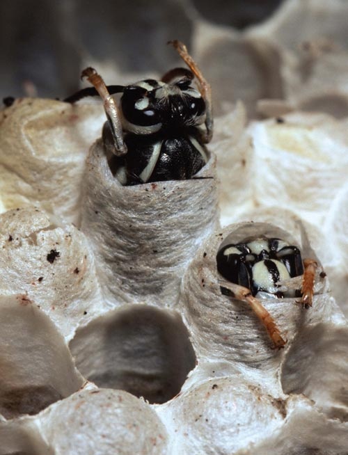 While on a late-spring hike, photographer Frank Kaczmarek came across a bald-faced hornet nest that had dislodged from a tree. He took out his camera and captured these new adults emerging from their cells, and naturally, soon felt a sharp pain in his left arm as the hornets began to defend their nest.