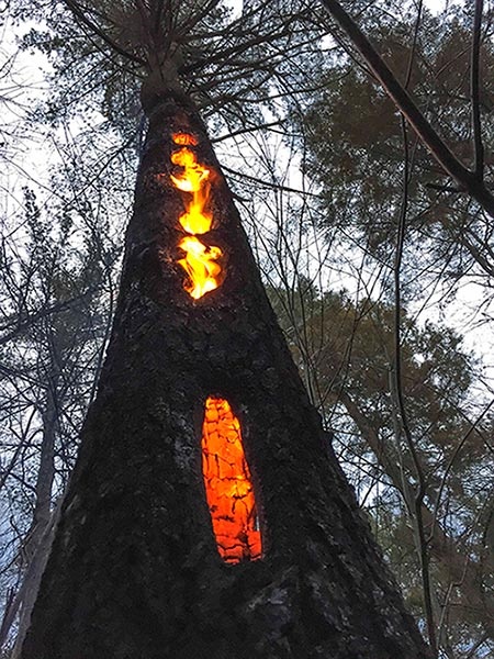 “Just after the snow melts away but before the growing season starts, the northwoods is vulnerable to wildfire. As a volunteer firefighter, I was assigned to a crew to extinguish hotspots after a wildfire was contained in Hartford, Vermont,” McFarland explains. “As we doused old logs and snags one after the other, near dusk we came to this tree. We were mesmerized by the hot embers in the hollow trunk and flames running upward and licking out of the old pileated woodpecker feeding holes. Armed with only an iPhone in my pocket, I snapped a few quick photographs before we had to move on with our work.”
