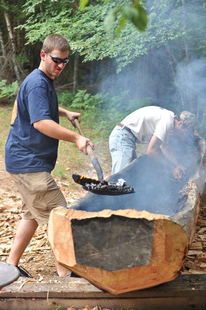 For those who moved on to the second week, there was an afternoon of training with a timber sports professional, a course on carving out a log to build a crude canoe, advanced training in techniques for felling trees with crosscut saws and axes, an introduction to skidding logs using draft horses, master classes in campfire cooking, orienteering, ax-sharpening, and a concluding team lumberjack competition.