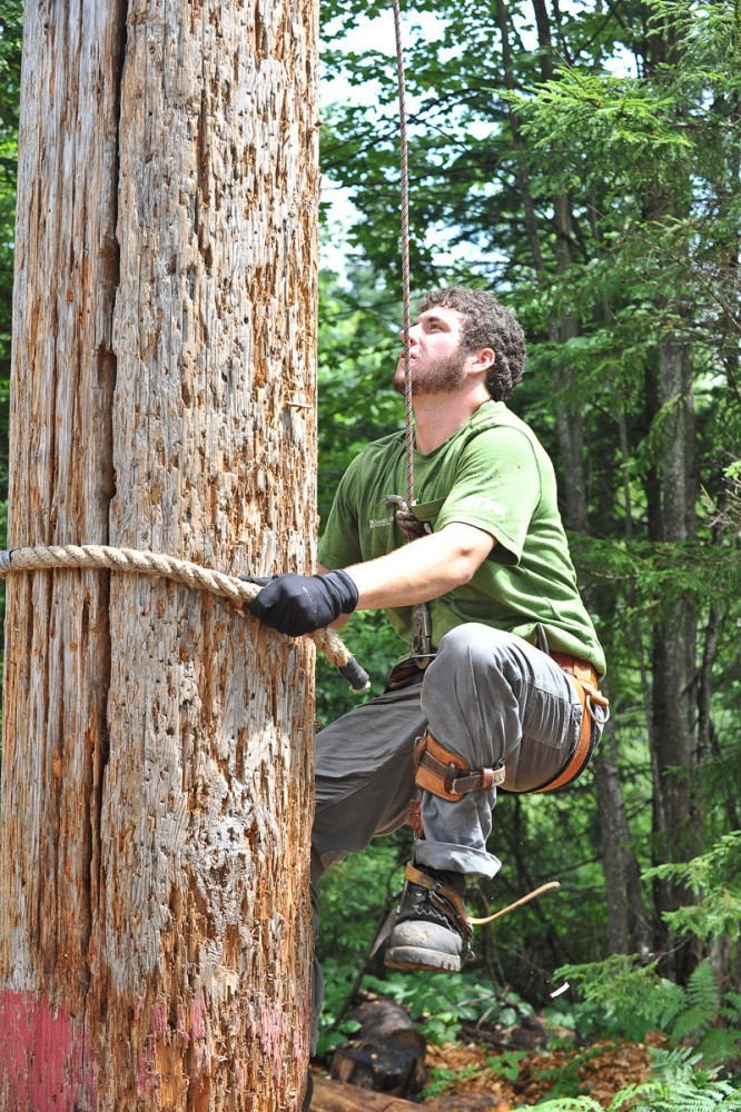 Instead of cinderblock walls, picture an outdoor classroom where towering white pines overlook a beautiful lake. Instead of bookbags and laptops, students tote bucksaws and throwing axes.