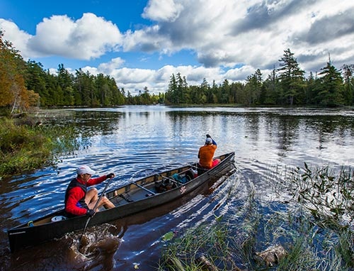As we set off, the canoes seemed caught up in the vastness of the surroundings – the forested swells that rose from rocky black shores, the arcing swatches of light that reflected off the wakes of other boats, the sky that changed from pastels at the horizon to azure overhead.