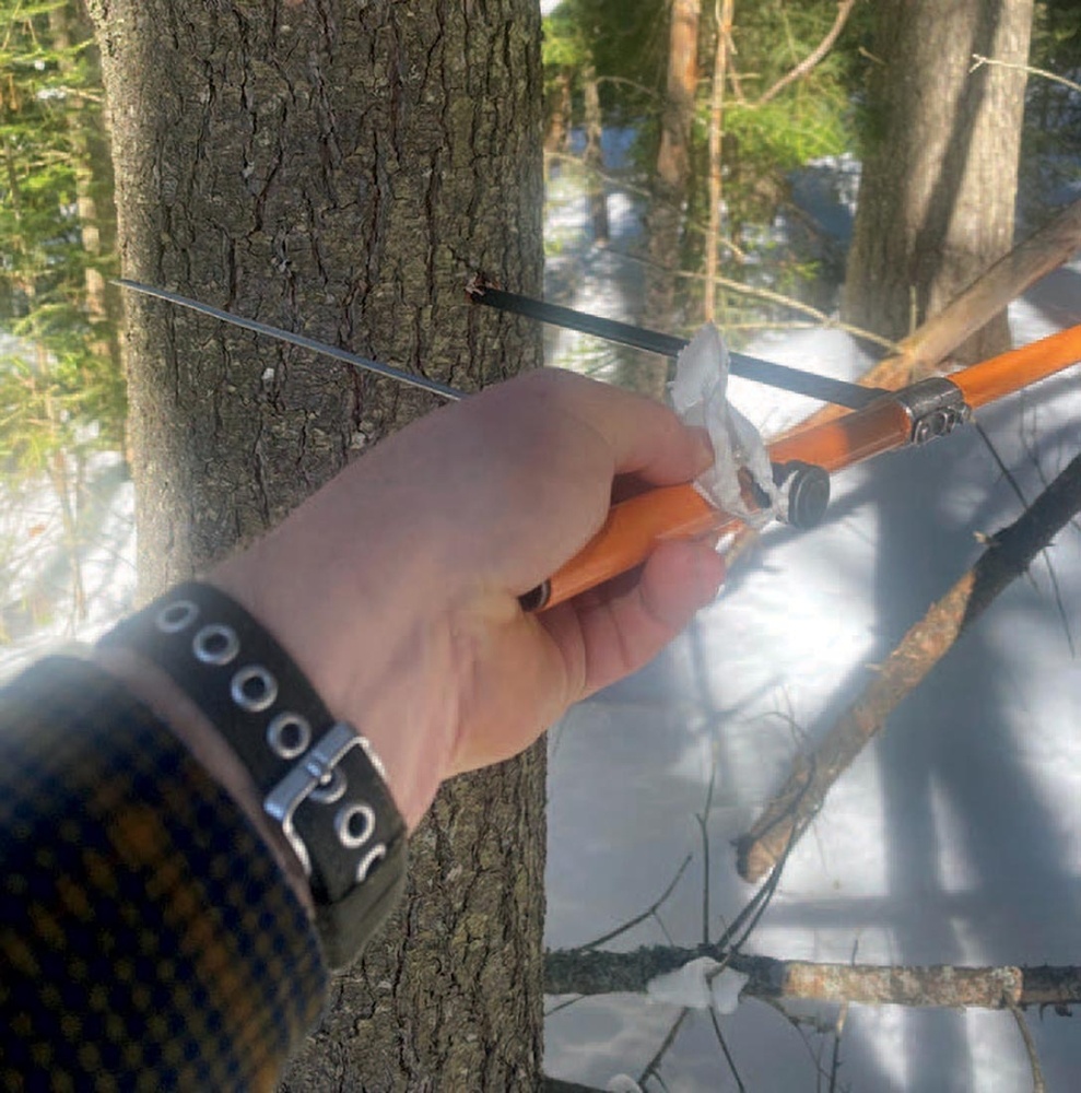 Step 2: The standard sampling height is diameter at breast height (DBH), or 4½ feet above the ground. Square yourself directly in front of the tree so that the tip of the auger is aimed at the middle of the tree’s trunk and the auger is parallel to the ground. If the tree has thick bark, it’s generally easier to start in a bark furrow (crevice). Push hard and screw the borer into the tree, turning its handles in a clockwise direction.