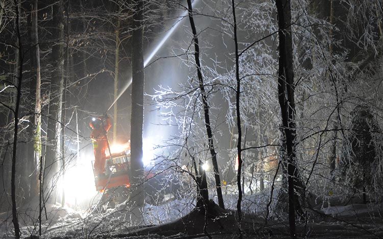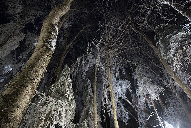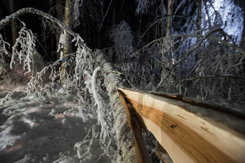 While the group of scientists is proud of the experiment’s unconventional execution and excited about the reams of data it will yield in the decades to come, by all accounts, the research conditions were absurdly unpleasant. All but a few of the icings took place at night, when the low air temperature and lack of sunlight would allow the ice to form quickest. In addition to the cold and the not-insignificant challenge of having to navigate a calamitous scene of falling trees in the dark, they also had to contend with the thousands of gallons of water being sprayed into the freezing air.