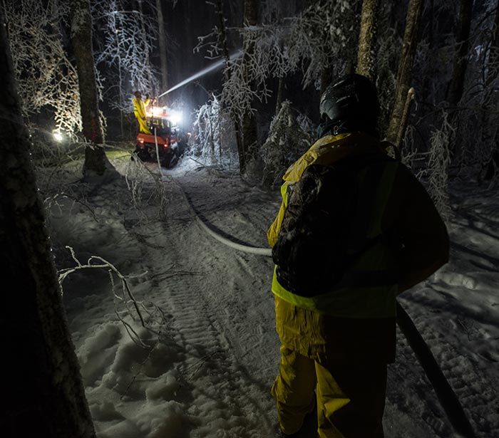It was interesting to look around and think of the chaos that had occurred just hours before: trees cracking and falling, a roaring water pump, a gushing fire hose, and 20 cold and wet scientists racing around trying to ensure that everything was going as smoothly as possible. It contrasted sharply with the eerie, frozen silence of the scene that remained the next morning.
