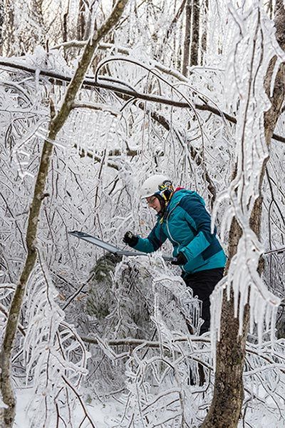 We paused for a moment in the plot that had been entombed in three-quarters of an inch of ice, where many of the trees had been ripped to icy shreds by all the weight. “There’s something about these storms that is so sublime,” Rustad noted thoughtfully. “There was a point during each one of these icings when we could all feel the conditions suddenly tip from beautiful to dangerous. In one moment we were marveling at how strange and magical it all looked, but in the next, the whole canopy was suddenly coming down, we all had to run away from the plot, and I have to tell you, it was truly scary. It was like at any given moment you didn’t know what was going to happen, and you feared it could be anything.”