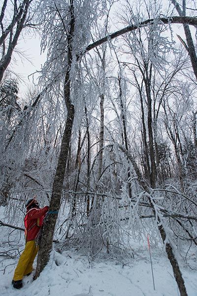In North America, ice storms typically wreak havoc in a belt stretching from Texas to southern New England, but climate-change science suggests that as the planet warms, the particular atmospheric conditions necessary for the deadly storms will become more common across a broader and more northerly geographic range. What’s even more alarming is how little we still know about the ecological impact of ice events. “No long-term ecological study of ice storms has ever been conducted,” said Lindsey Rustad, one of the experiment’s investigators. “We know from the literature that they are very likely to become more frequent and more severe, and yet there is hardly any quantified record of their effects on the edge of a northern hardwood forest.”