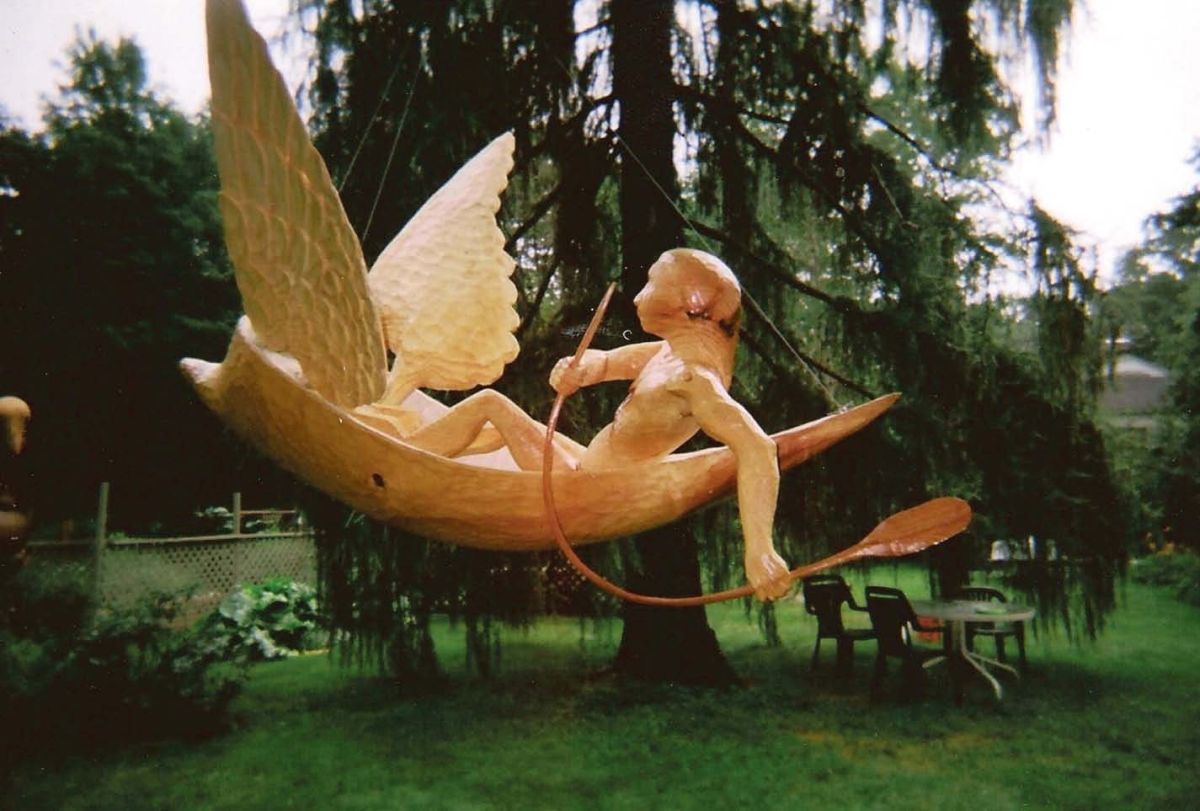 From the trees he harvests, Mark Fenwick sculpts his dreams. At the end of his dirt drive in Guilford, Vermont, a dancing bear, larger than life, poses on one paw, beguiling passersby. Beyond it, an abstract Buddha spirals away from the world, wielding a feather like a saber. Why a feather? He smiles wryly. “Lightness of being, perhaps.” By the front door, amid red clover, a giant foot with horns jutting from the heel pauses as if to say, “Just stepping out of this planet.”
