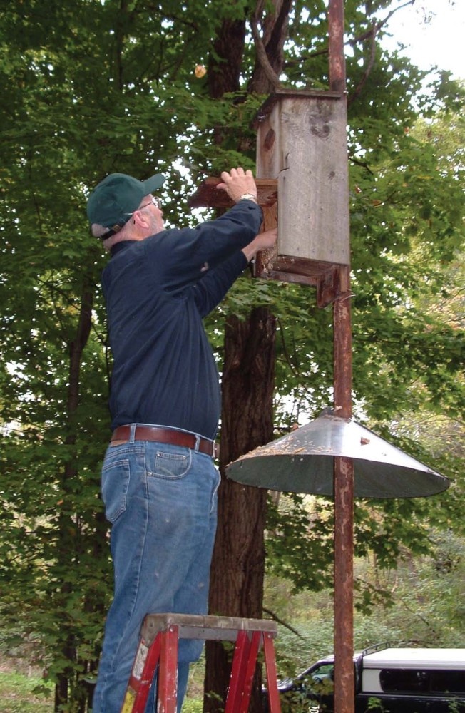 Most people think of wood ducks as nesting in boxes placed in the open, on posts in a marsh or pond. According to Odell, this location for a nesting box leads to the “nightmare of dumpnesting,” where several hens lay their eggs on top of one another’s, leaving as many as 60 eggs in one box, of which only 8 or 10 hatch. The solution at Northern Montezuma, and elsewhere in Region 8, is to erect isolated artificial nesting cavities in nearpond woods until the trees can mature enough to provide natural nesting cavities for the once-threatened but now-thriving wood duck.