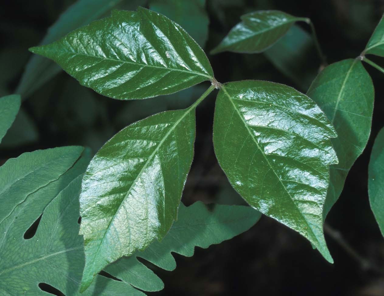 The king of Northeastern rash plants is, of course, poison ivy (Toxicodendron radicans). The plant can be identified by its almond-shaped leaves that have subtle teeth along the edge. The leaflets appear in clusters of three, and the middle leaflet has a longer petiole. Poison ivy grows both as a ground cover and as a woody vine that climbs trees by means of aerial roots. Western poison ivy (Toxicodendron rydbergii) is also found in the region, and appears as a straggling shrub. Both types of poison ivy prefer warm, rich sites over cooler, thinner, higher elevation sites.