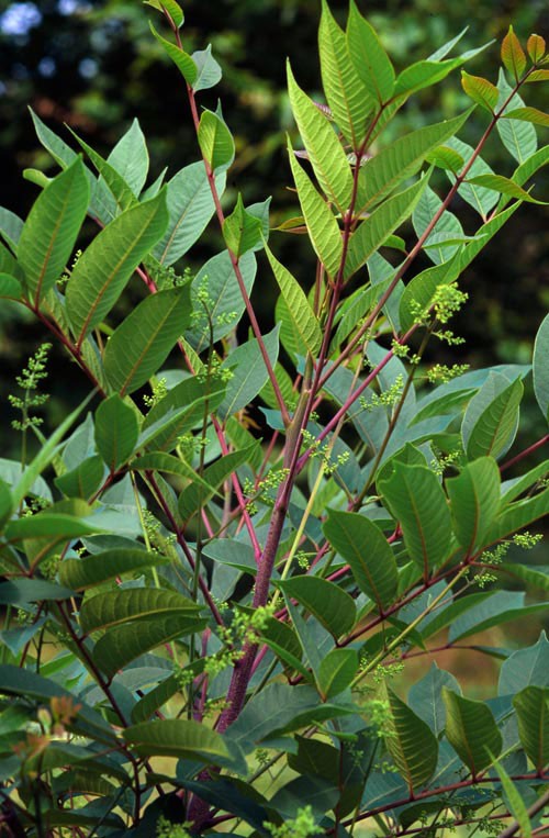 One of the more mysterious plants in the Northeast, poison sumac (Toxicodendron vernix) is a small tree/large shrub, branched at the base, with compound leaves and grayish-white fruit. Unlike the staghorn sumac in your backyard that has serrated leaflets and hairy bark, poison sumac has smooth leaf edges and smooth bark. The plant exists throughout the region, but because it grows in wetlands, not many people typically see it. (Specifically, it favors fens, a type of stagnant wetland.)