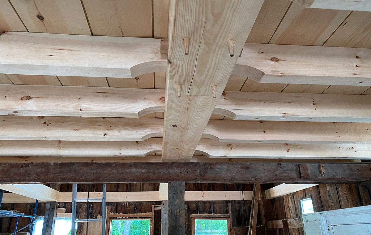The image also shows curved reductions in the joists where they connect to the beams. “This is an attractive detail, but actually help the joints perform better in practice because they help prevent splitting in the beam from the sheer force of the load above,” said Adam. “The stress of the load is distributed along that whole curve so that the joists don’t split (the stress would concentrate at the corner of a square reduction, often tempting it to split).”
