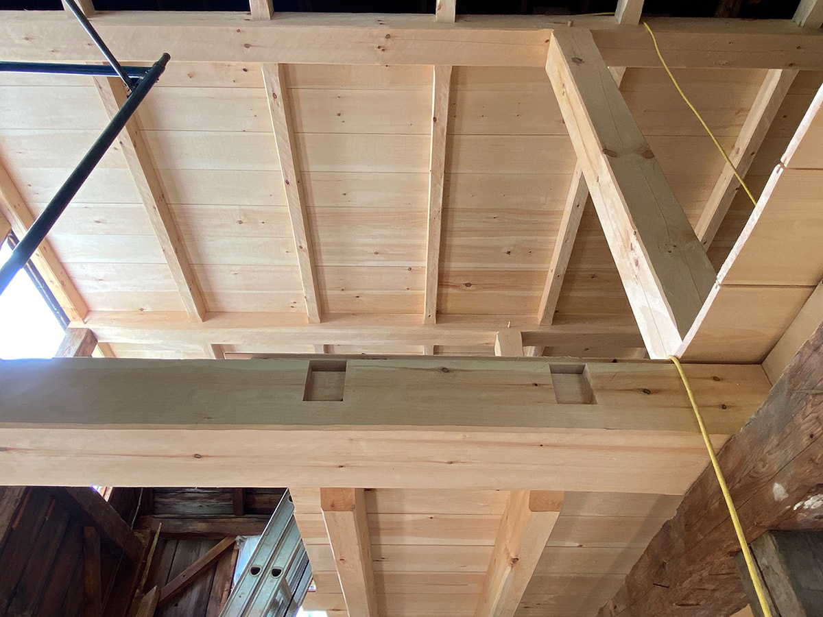 Carpenter and writer Adam Miller recently completed the timber framing portion of a barn that is undergoing renovation in Lyme, New Hampshire. The project is part of a small senior housing development next door to the Northern Woodlands office. Staff here have been watching with great interest the changes to the post and beam barn and the adjacent main house. Notably, property owner Ray Clark is focused on supporting local sawyers and loggers, which has a ripple effect on the local forest products economy.