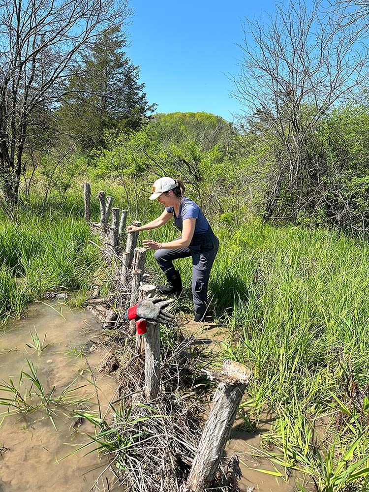 In October 2022, Hurley convened 15 youth crew members and staff from the NorthWoods Stewardship Center to spend two days building the project. The land, part of the state-owned Willoughby Falls Wildlife Management Area, had been ditched historically to allow for agricultural use, and the ditches were continuing to function as drains for this wetland, even though the farming had long ceased. In addition, berms running along the ditches, made of soil that had been dredged when the ditches were dug, also prevented floodwaters from spreading naturally. Hurley hoped that by building BDAs and other woody structures, and removing part of the berm, the project would essentially plug these ditches to stop the wetlands draining, keep floodwaters on the floodplain longer, promote native plant growth, and improve habitat for nearby beavers.