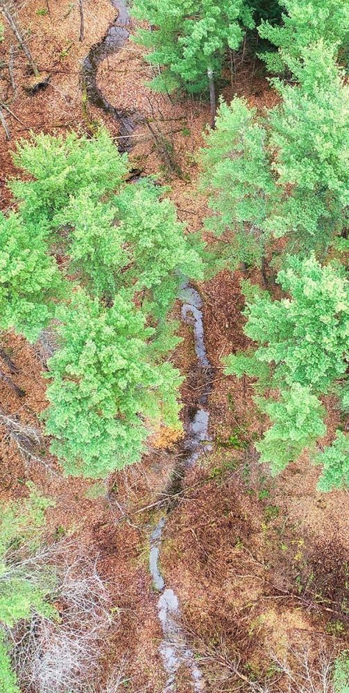 On another piece of VLT-conserved land in Charlotte, beavers have been transforming the valley around a small stream into a diverse wetland complex for years. After exploring the maze of dams, channels, and canals here one January day, I returned to the office to compare aerial maps, including high-resolution drone imagery, which allowed me to see how the dams relate to each other. At least 10 dams of varying sizes occupy the roughly 1,800-foot-long stream reach. These have shifted over the years in relation to each other: as one dam impounded water, flow patterns changed, and beavers responded by building additional structures upstream, downstream, or in newly emergent flows around the margins. They also extended structures farther across the valley. Human-designed BDA projects aim to create functional complexes of dams that will complement each other in slowing and spreading water. The projects I’ve worked on have each included at least 10 structures.