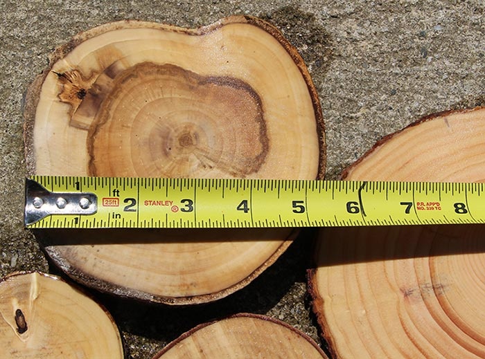 We can learn a lot about a tree’s history by examining its growth rings. The rings can tell us how many years a tree has been growing (simply count the rings), but also the rate at which that growth is occurring (a wider ring indicates more growth in a given year, a tighter ring less growth). The easiest way to inspect growth rings is on a stump, or better yet on the butt-end of the first log. (Stumps tend to flair, which can distort the rings.) You can get a look at the rings in a standing tree, though, by using a tool, called an increment borer, which allows you to drill into a tree stem and extract a small core.