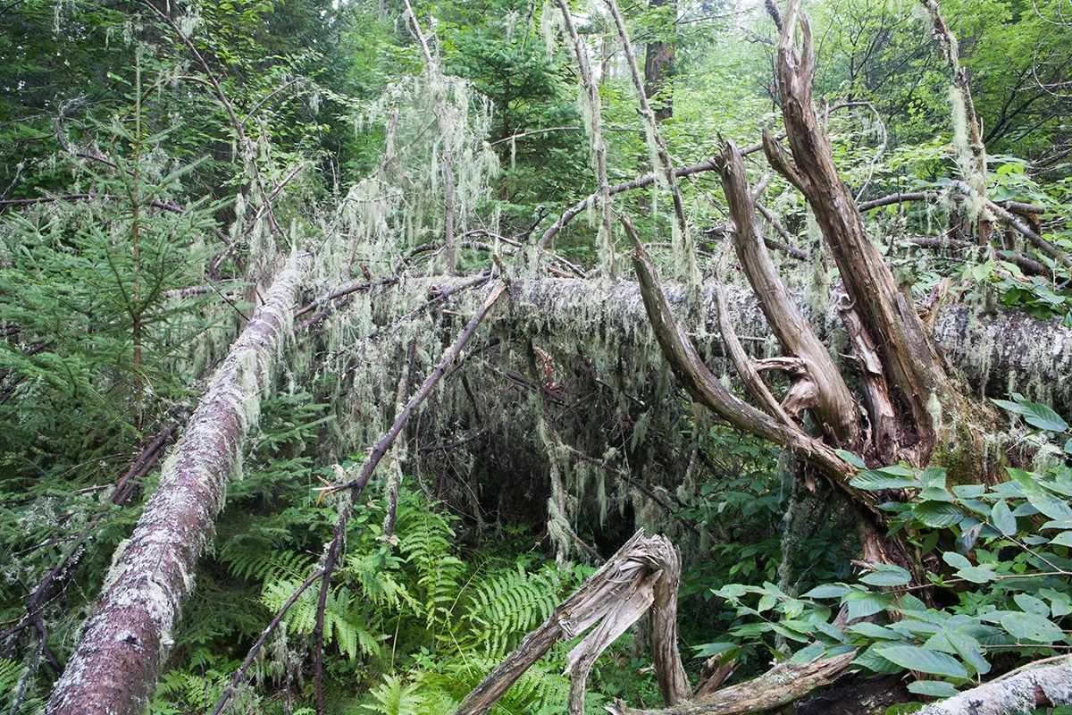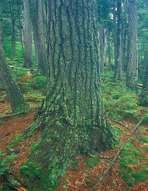 By the purist metric, Big Reed constitutes 75 percent of the old-growth forest in Maine. (This number does not include subalpine dwarf old growth, which for practical reasons have never been harvested.) The rest of the old growth is scattered among 82 sites, averaging 20 acres each. So the thousands of contiguous acres at Big Reed truly are unique.