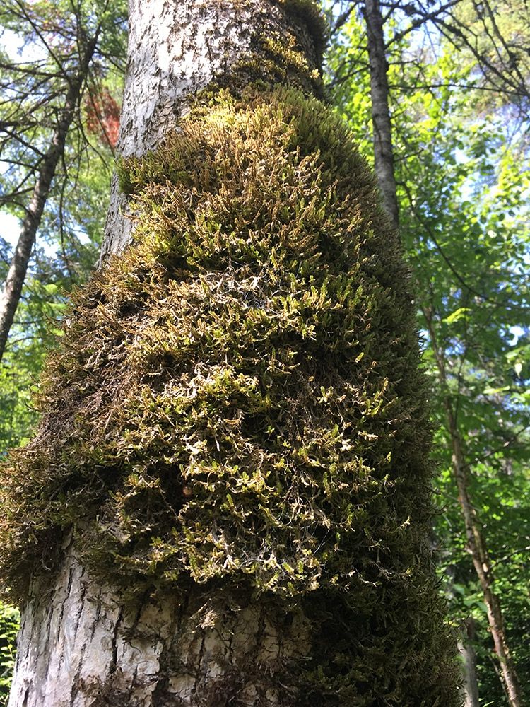A few steps had taken us from one type of forest, a young one, to a much older one. It took a few moments for the mind to grasp the differences. Big trees, widely spaced. Sugar maples two feet in diameter, their bark deeply fissured and dotted with lichens. Yellow birches so big and old the brassy, peeling bark of youth had turned gray and furrowed. The size of the standing trees was matched by the size of the trees on the forest floor. Silvered, mossy boles scattered through the woods.