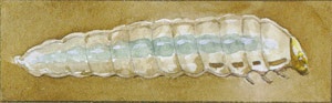 An insect has to be quite small to succeed at mining leaves. Working conditions are cramped, and the leafminer larvae that live in and eat the palisade cells and spongy mesophyll that occupy the interior of a leaf are flattened, as well as being small. Sometimes a dozen or more larvae feed within a single leaf and consume all but the papery dead skin, eliminating all shades of green. A medium-sized birch tree can feed tens of thousands of leafminers.