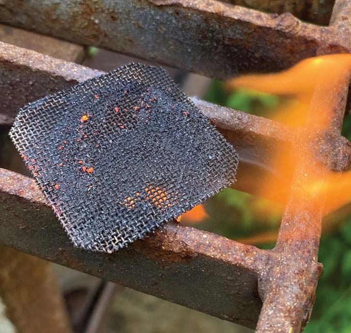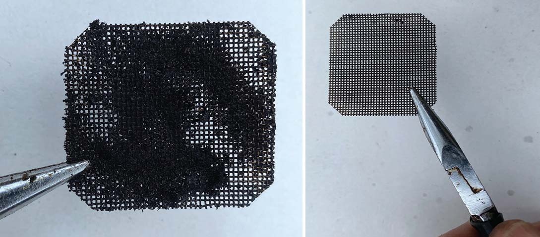 To fix the clogging, first remove the muffler cover on the chainsaw. Once you do this, you’ll be able to access the spark arrestor, as well as to inspect the condition of the piston through the exhaust port. In this case it was instantly obvious that the spark arrestor was clogged with carbon deposits. Depending on the make and model of your saw, there may be either a screw or retaining tabs that need to be bent before you can remove the spark arrestor with a pair of plyers.