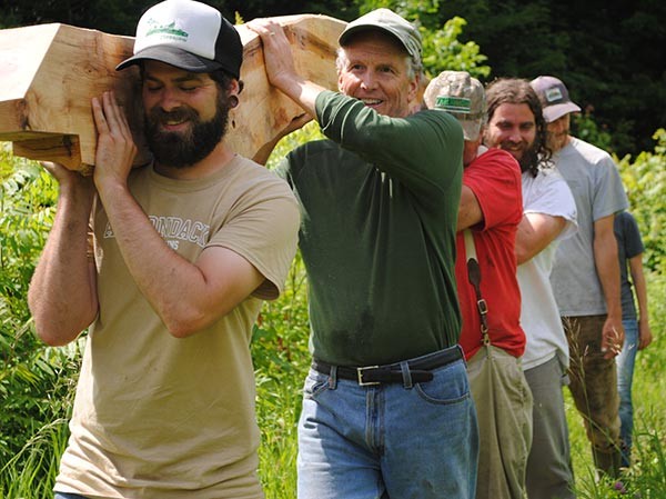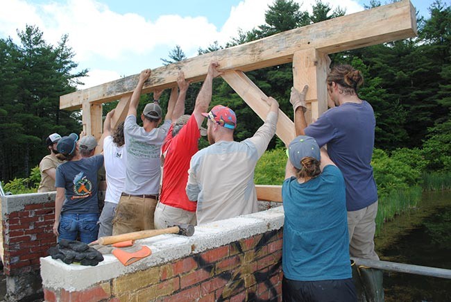 It was the late afternoon of a long day of hauling timbers, sawing posts, and hammering hand-carved wooden pegs. Excitement ran high among the 10 workshop participants as they carried the first section of a timber frame along a concrete walkway that protrudes from the earthen dam of Norton Brook Reservoir in Bristol. The walkway leads to the foundation of what was once a gauging station, back when the city of Vergennes used this reservoir as its water supply.