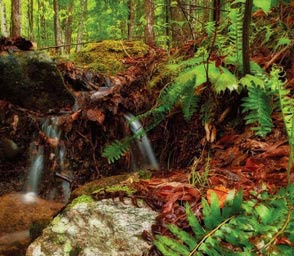 Water first enters our landscape in the form of rain, snow, sleet, fog, or hail. Forests may influence the occurrence and distribution of local precipitation, but their most significant contribution is in how forested watersheds receive and deal with all the water that falls on them. Forests absorb and reroute water – thereby diffusing its potentially damaging energy – before slowly releasing the water into seeps, ponds, lakes, rills, brooks, streams, and rivers. The net hydrologic effect of the forest is to delay and reduce the size of the flood peak.