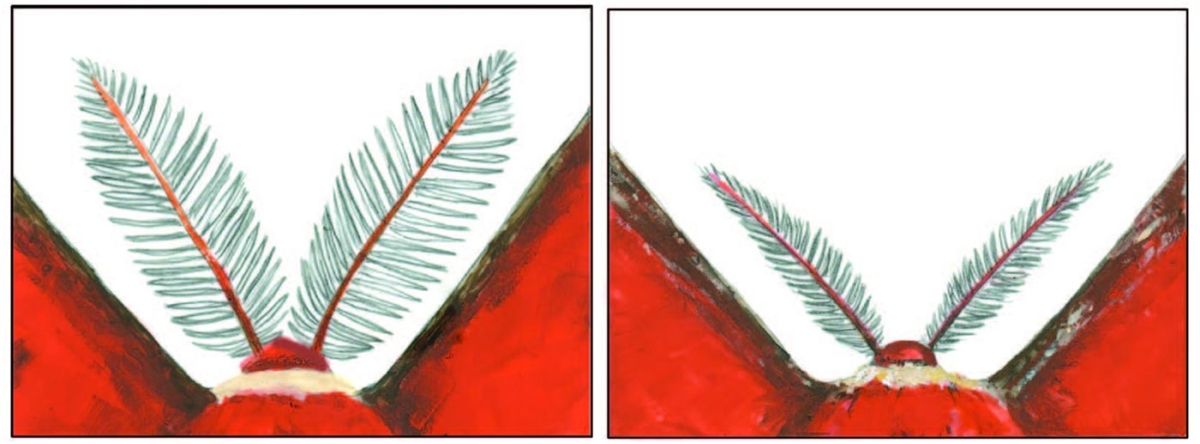 Adult cecropias have a singular mission – reproduction – and males may fly long distances to mate. The males’ large, featherlike antennae, distinguishable from the slenderer antennae of females, are studded with olfactory openings called olfactory sensilla (singular: sensillum) that detect female pheromones on the wind from miles away. Insects use their paired antennae to determine the direction odors come from and follow pheromone trails upwind.