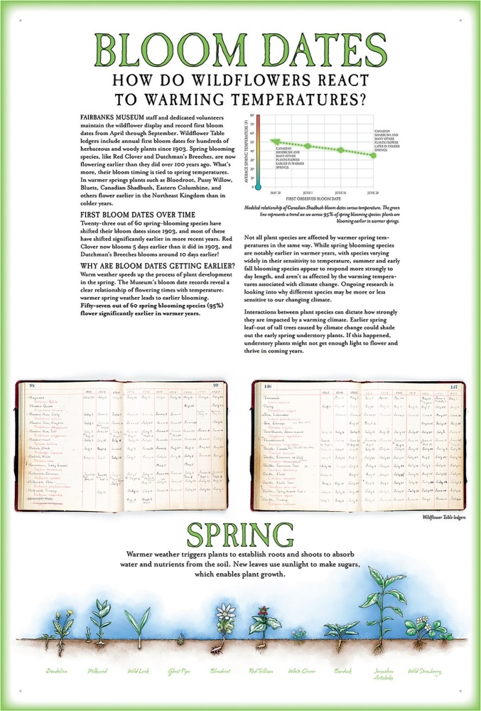 Using some of these findings, the museum has created six large interpretive panels to complement the Wildflower Table display. These panels include information about how the table started and has continued, and also offer text and graphics to explain how the records from more than a century ago are informing researchers now.