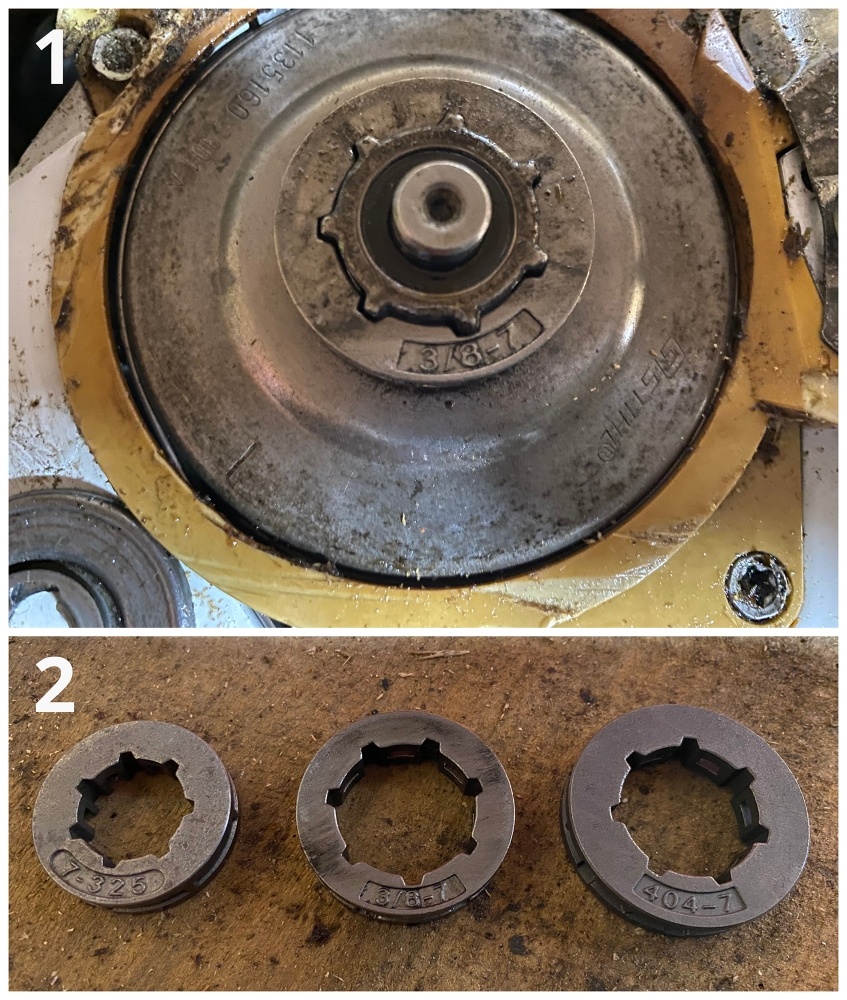 Sprocket: Attached to the crankshaft of the saw is the sprocket, which rides on a bearing and is usually held in place with a washer and C-clip (on chainsaws with inboard clutches). The sprocket will indicate the chain pitch that it’s designed for, as well as the number of teeth for the sprocket. (Photos 1 & 2)