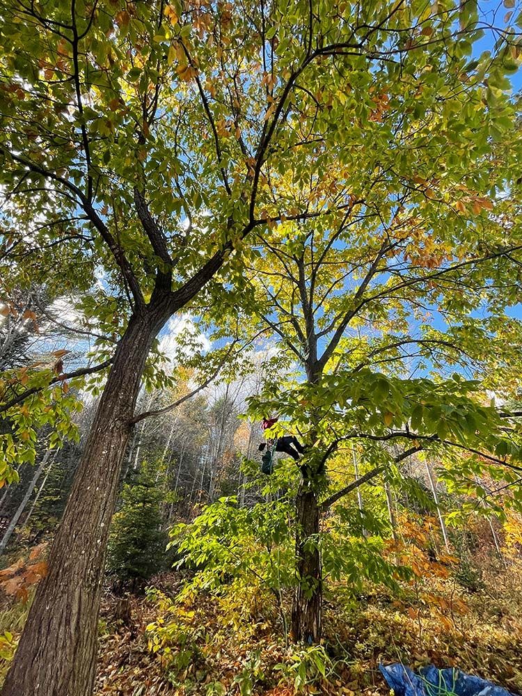 So, I wrote an out-of-office email, skipped class, and packed my car with my climbing saddle, rope, and helmet. I met Mazurowski at his house in central Vermont, before the autumn sun had burned off the morning fog. Despite the early start, the energy in the car was palpable, an excited and nervous buzz. It had only been three days since Heinrich contacted Mazurowski to warn him that the seeds were opening, but we were worried that we were still too late.