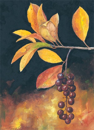 However lovely the flowers, chokecherry is even more beautiful in the autumn, when its shining fruits turn from green to red and then proceed to develop their final, rich purple color. Fruit production is reliable and prodigious: often the branches are bent with the weight of many cherries. Over 70 bird species are known to eat chokecherry, and it is a preferred food for many of them.
