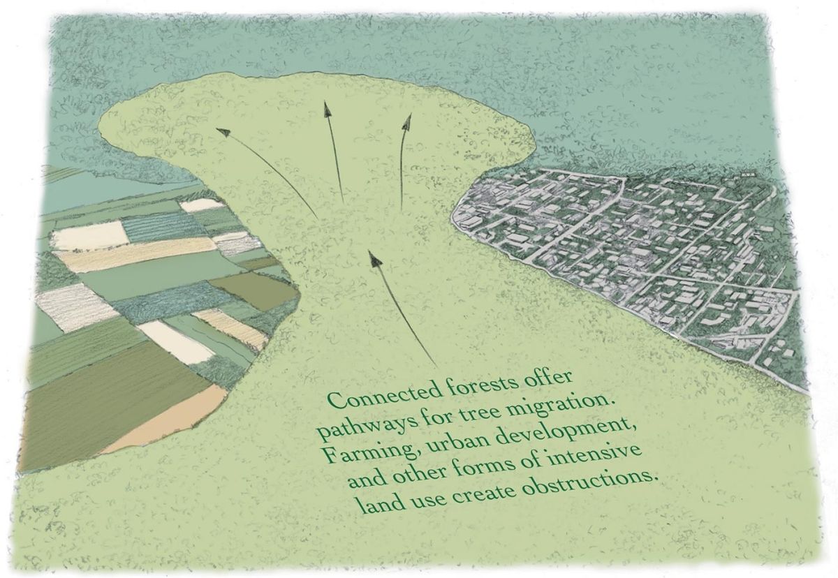 As noted above, numerous factors influence a tree species’ ability to migrate, including land use changes, how quickly trees within that species attain reproductive age, seed viability, competition from other plants, weather patterns, herbivory, and insects and diseases. This means that even if a location offers suitable habitat for a tree species in the future, that species may not be able to become established there.