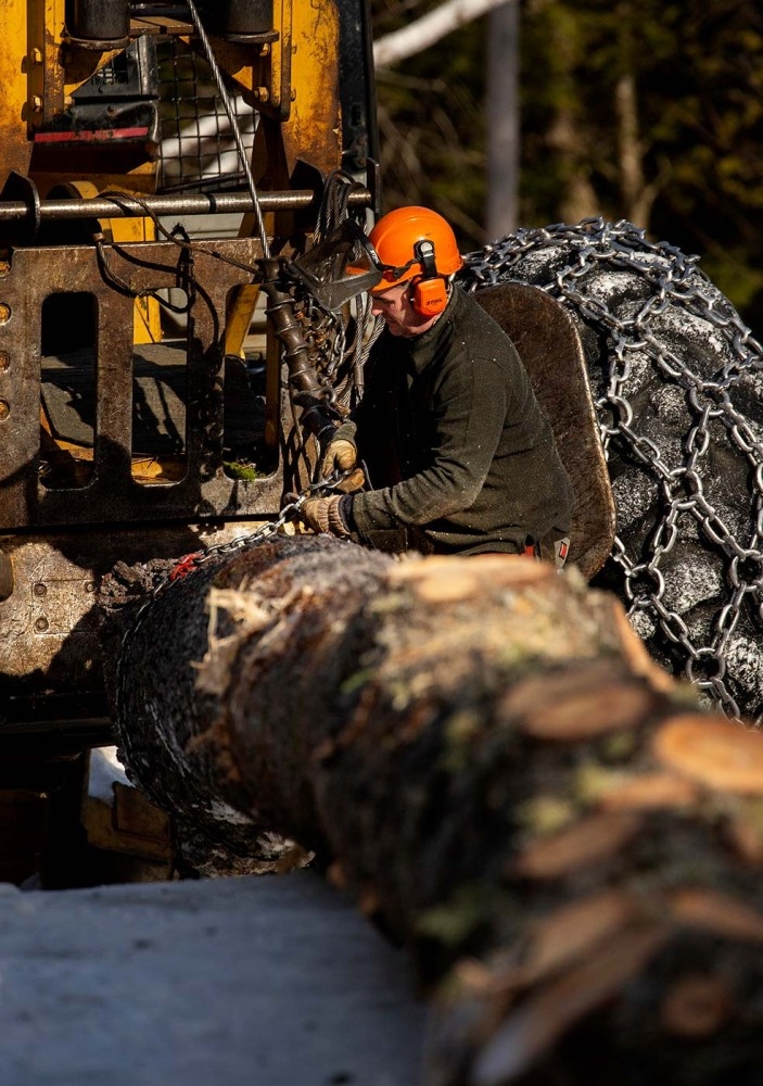 Logger and independent contractor Lee Russell has been working in the woods for nearly 30 years, and has been self-employed since 1997. Here, photographer Ashley Conte follows along with Russell as he harvests wood for Katahdin Forest Management along the Golden Road in Millinocket, Maine. This 50-acre site is being managed for shelterwood, and Russell selects the trees to be cut to allow more light on the floor to promote regeneration of spruce and pine. He typically harvests sites anywhere from 20 to 350 acres in size, and often works in timber stands that are under special zoning along waterbodies and call for limited tree removal or prescriptions that include wildlife habitat enhancement. Russell sees opportunity for young people to enter the field as conventional loggers, particularly with smaller tracts of land, and would love to be an instructor some day.