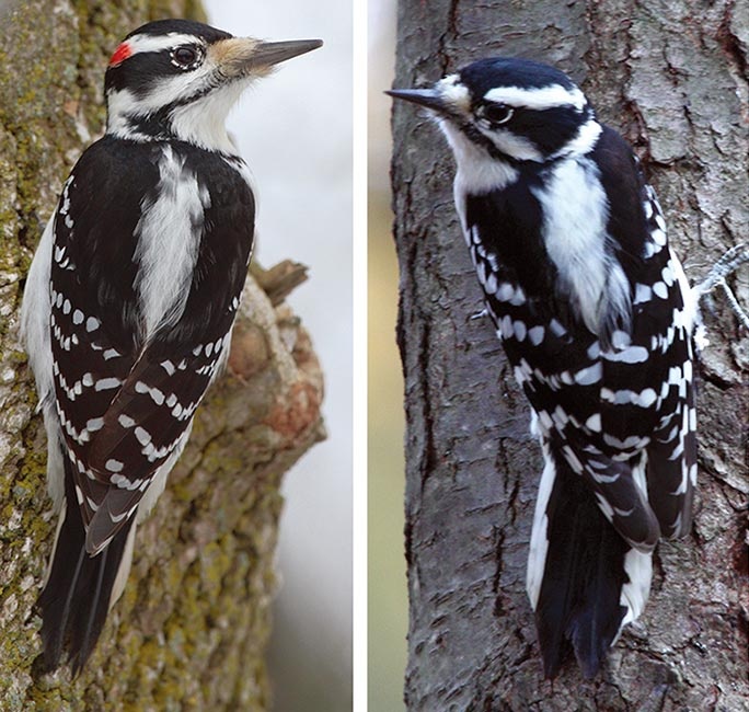 One other way to tell the two apart is that the downy seems more enterprising. It generally offers you 9 to 16 drumrolls per minute during breeding season, pausing only a few seconds between each rendition. From the hairy woodpecker, you might only hear half as many drumrolls per minute — about four to nine of them.