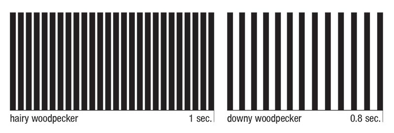 From here, the identification gets a bit more difficult. Your first real test in drumming class is to discern the drumrolls of the most widespread and abundant woodpeckers on the continent: downy and hairy. They look alike and they drum alike: a classic rapid roll.