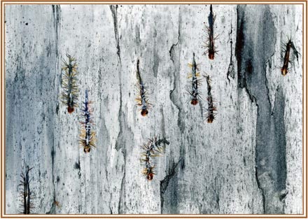 First, an infected larva loses its plump profile, and then it shrivels as its insides are devoured and converted to fungus. After the caterpillar dies in four to eight days, the fungal biomass undergoes another change as it shifts to spore production. Spore-producing structures emerge from the carcass, and large numbers of spores are released. The dead caterpillar’s white hairs are coated with spores, and they are carried by the wind to other caterpillars. In the end, just the skin of the corpse remains, hanging by its prolegs in the foliage.