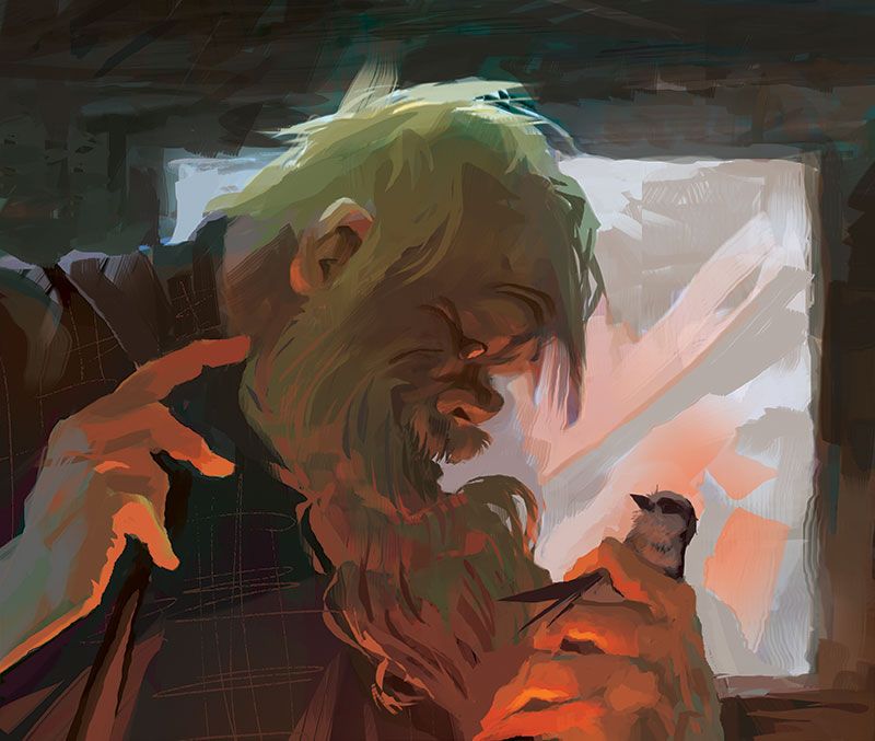It must have been around two o’clock when the storm was at its worst that the bird come – the little half-froze gorbie. He come an’ fluttered his wings ag’inst the winder an’ the wind caught him an’ blew him away like a wisp of paper. An’ then in the space of a few breaths he was back ag’in an’ Esau looked up an’ seen him there flutterin’ an’ beatin’ his wings ag’inst the pane. The bird dropped to the sill an’ huddled into the corner where the frame was let into the logs, an’ Esau got onto his feet an’ stepped quick as a cat to the winder.