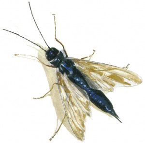This newly-arrived horntail is a large, robust insect, 1 to 1.5 inches long, and a strong flier, with a high reproductive capacity. In mid-summer, as many as 450 eggs might be laid by a large female; smaller ones are much less fecund. Its preferred host trees are stressed pines, and vulnerable pine species are found throughout most of the U.S.
