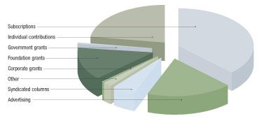 What I find most remarkable about the chart – and well worth trumpeting – is how much of our funding comes from individuals. If you combine subscriptions with individual contributions (those are donations on top of the cost of the subscription), that accounts for 60 percent of our budget. That is truly impressive. So when you follow the money that funds our efforts, the trail leads to you, our readers.