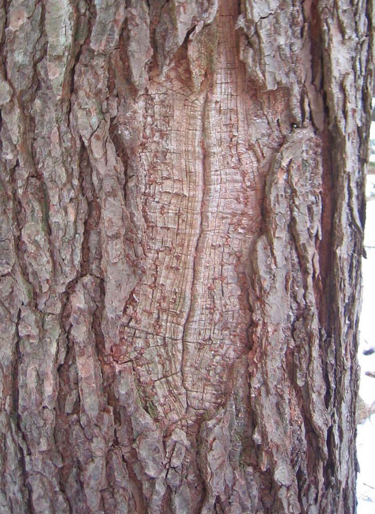 Like the exterior walls of a house, outer bark not only regulates temperature, it also protects against intruders. In general, thin-barked species like American beech are easier to penetrate than species with thick bark, like northern red oak. But bark of any thickness has weak spots at lenticels, at cracks and furrows, and at branch junctions, where wrinkles bring the inner bark closer to the surface. Wounds in the outer bark open pathways for invaders such as fungi, bacteria, and insects, but in most cases the bark’s chemical and structural defenses can overcome infections and infestations.