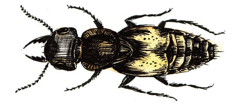 Staphylinid beetles are another carrion visitor, opportunistically eating maggots while depositing eggs of their own. Unlike most beetles, Staphylinids have short elytra (wing covers), which look like short capes. This allows them to curve their elongated bodies and to maneuver into tight spaces.
