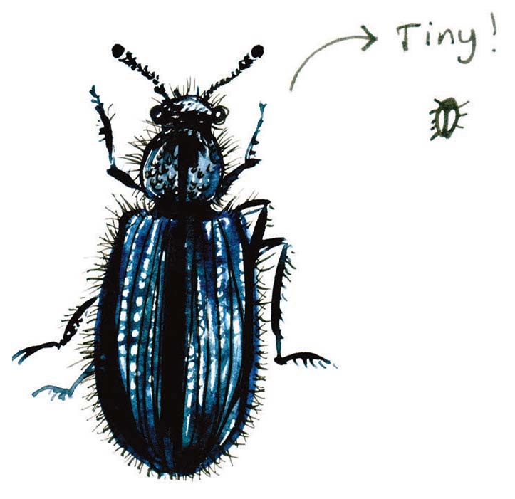 When a carcass is old and drying up, it might be visited by ham beetles. As you might imagine from the name, these beetles also visit dried hams hanging in smokehouses. I was delighted to find these beetles one spring on a deer skeleton. Identifying an unknown beetle can be intimidating, but this was relatively straightforward: the metallic blue body covered with stiff black hairs and stout antennae gave it away. It was Necrobia violacea, a European native that appears to have been introduced to North America by people and their love for cured meats.